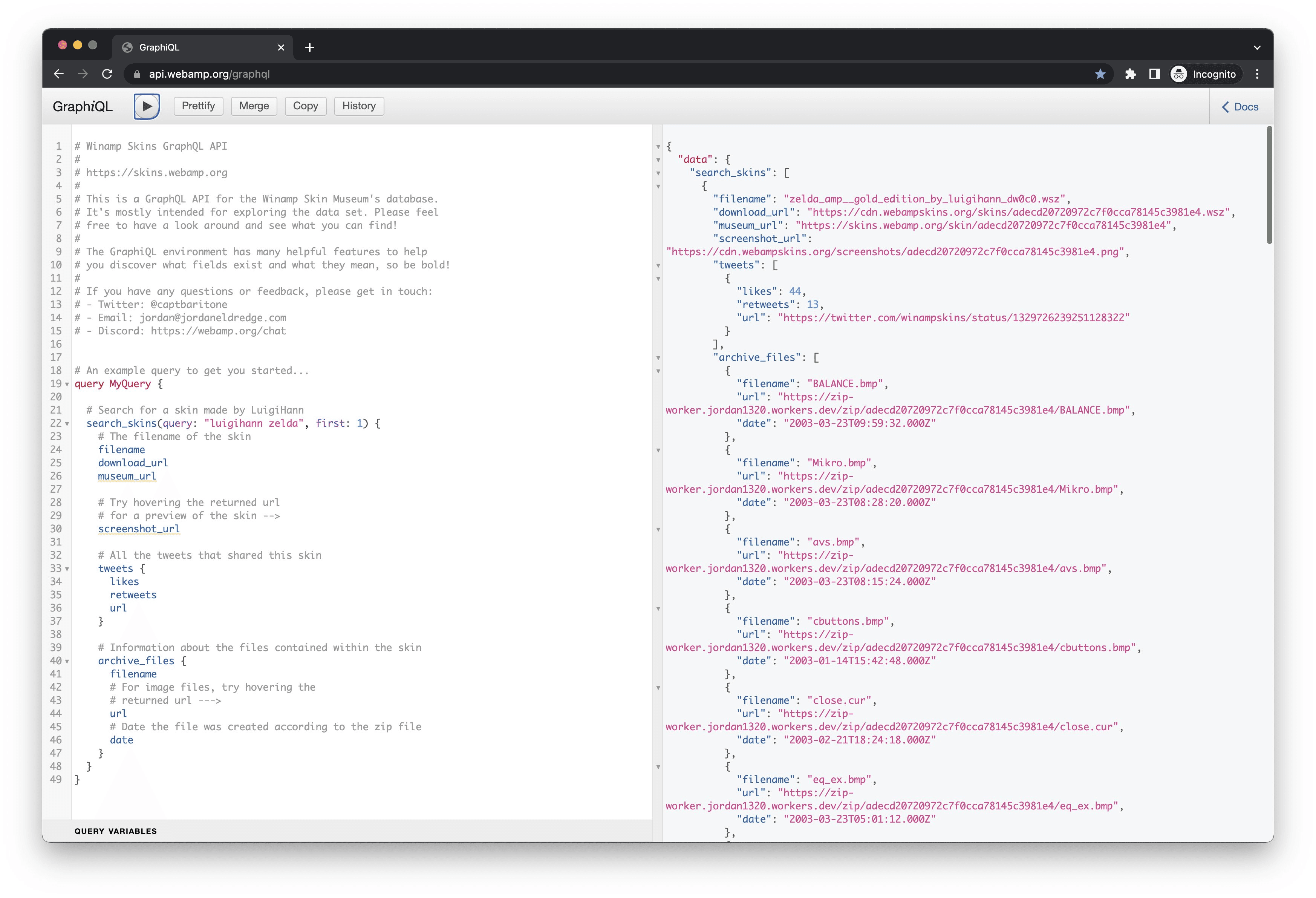 The Winamp Skin Museum is powered by an sqlite3 database containing 1.2gb of metadata about 86,000 Winamp skins and exposed as a public GraphQL endpoint